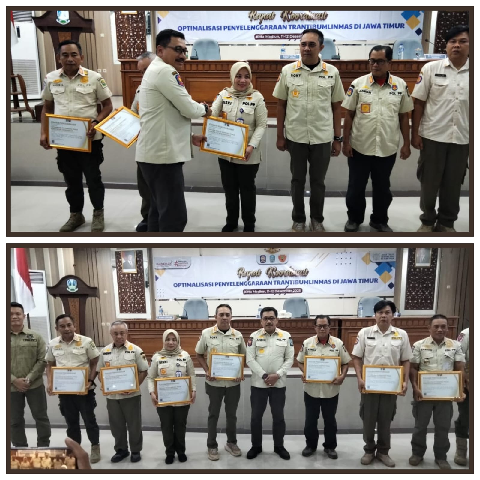 Satpolpp.bojonegorokab.go.id, Bertempat di Gedung Bakorwil Kabupaten Madiun pada Rapat Koordinasi Optimalisasi Penyelenggaraan Ketentraman, Ketertiban Umum, dan Perlindungan Masyarakat yang digelar oleh Satuan Polisi Pamong Praja Provinsi Jawa Timur pada 11–12 Desember 2025. dilaksanakan penyerahan penghargaan kepada seluruh Satpol PP Kabupaten/ Kota atas partisipasi dalam kegiatan lomba Poskampling Jogo Jawa Timur, sekaligus penetapan Desa/ Kelurahan SIGAP Trantibumlinmas.