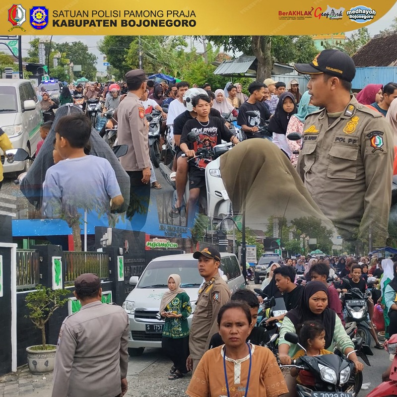 Personel Satpol PP Kabupaten Bojonegoro bersama Polsek Ngambon melakukan pengamanan serta pengaturan lalu lintas guna memastikan kegiatan berjalan tertib, aman, dan lancar tanpa mengganggu arus kendaraan di jalan.
